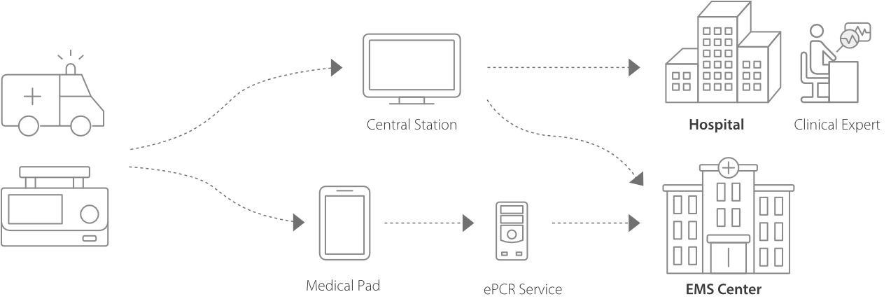 Данные о вентиляции лёгких и мониторинге состояния пациента во время транспортировки могут передаваться в больницу в режиме реального времени. Медицинский персонал может удалённо контролировать вентиляцию лёгких и жизненно важные показатели пациента с помощью CMS (центральной системы мониторинга) больницы или системы ePCR для своевременного составления плана лечения.
