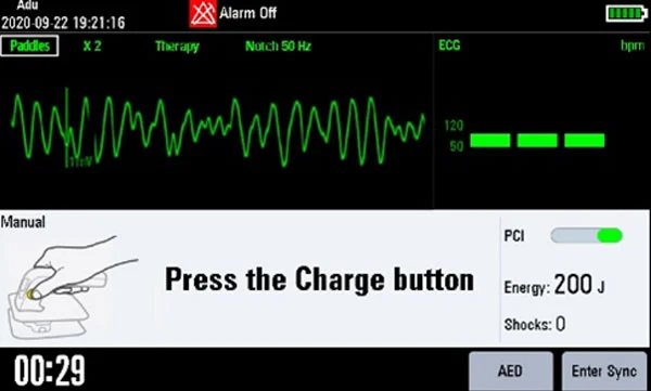 Кнопки для выбора мощности, зарядки и подачи разряда повышают удобство использования для врачей. Индикаторы контакта с пациентом как на манипуляторе, так и на экране позволяют визуально контролировать контакт с пациентом для обеспечения эффективности выписки.