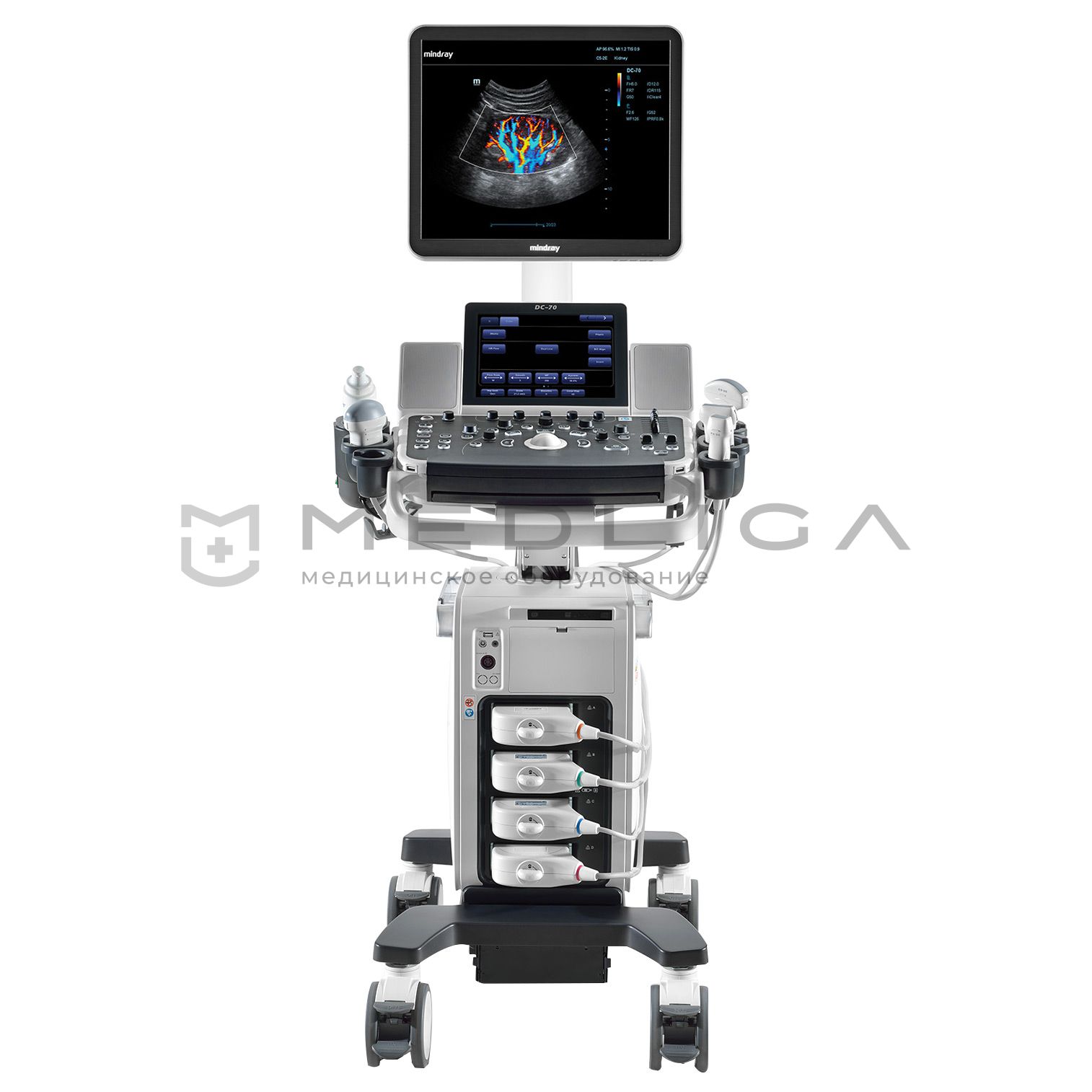 Mindray DC-70 – современная ультразвуковая система стационарного типа с чувствительным сенсорным дисплеем с диагональю 10,4 дюйма, а также удобным в эксплуатации жидкокристаллическим монитором с диагональю 19 дюймов на шарнирном кронштейне.