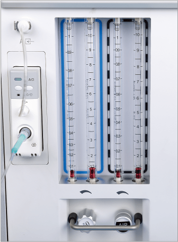- Индивидуальные регуляторы потока с помощью двойных расходомерных трубок обеспечивают простое и точное управление, облегчают легкую и точную анестезию с минимальным / низким потоком