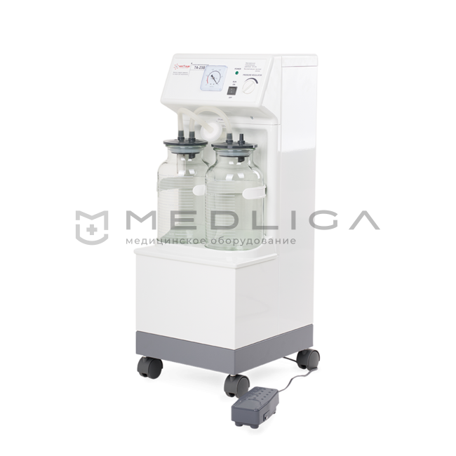 Передвижной хирургический отсасыватель в металлическом ударопрочном корпусе. Аппарат рассчитан на непрерывную работу в течение 4 часов. Применяется при проведении длительных операций высокой сложности. Для оперативного дистанционного управления устройством имеется удобная педаль запуска. Устройство комплектуется специальным металлическим наконечником, который необходим для полостных операций.
