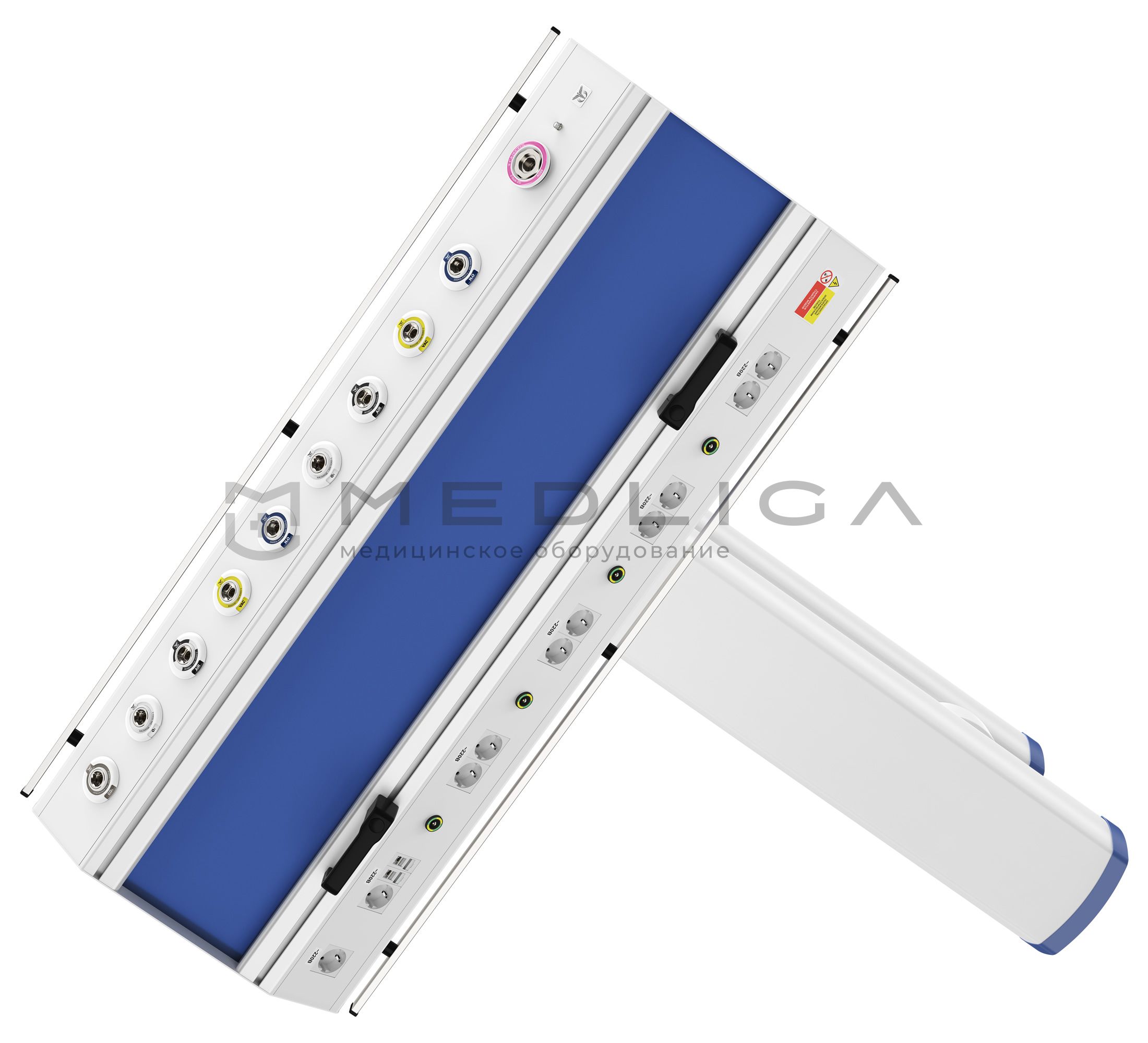 Настенная медицинская консоль CADUCEUS (Кадуцей) C2E-A комплектуется разъемами быстрого соединения медицинских газов, разъемами RJ-45 для передачи данных, и электрическими розетками. Продуманный дизайн позволяет эргономично разместить все компоненты, а удобная ручка способствует быстрому перемещению консоли в пространстве без особых усилий.